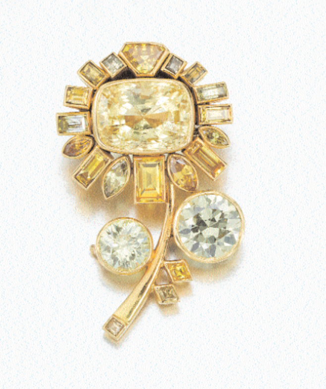 Citons, à ce titre, quelques exemples emblématiques de cette approche : un clip Grappe de raisin associant des saphirs bleus et jaunes, et une broche issue de son propre écrin personnel. Cette dernière, en forme de fleur stylisée, marie un saphir jaune taille coussin allongé à des diamants jaunes de tailles et de teintes fantaisie. Cette composition incarne à la perfection l’expérimentation chromatique chère à Suzanne Belperron, où chaque pierre est choisie pour sa nuance expressive plutôt que sa conformité.